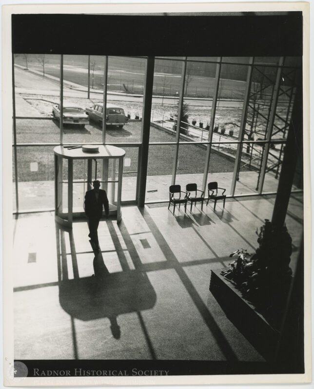 As described in a caption on the back of the photograph, “An early visitor enters new headquarters and training center of Burroughs Military Field Service Division on its first day of operation on December 15. View is of main lobby, looking out on Radnor-Chester Road and grounds of Sydney V. Rowland Elementary School.”
