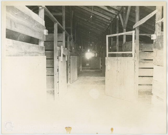 Empty stables at a fairgrounds, likely at the Devon Horse Show.