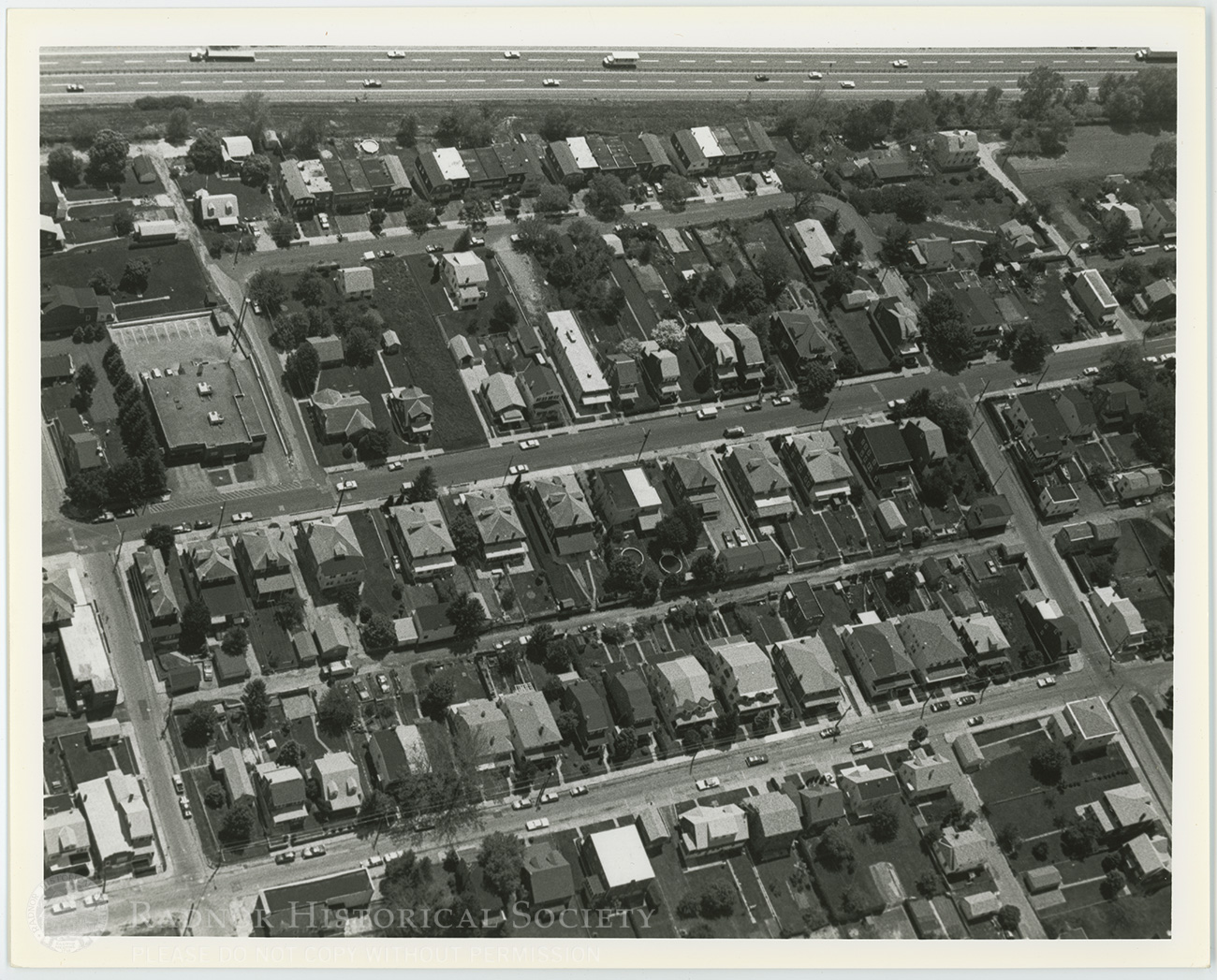 Aerial view of an unidentified neighborhood adjacent to a highway.