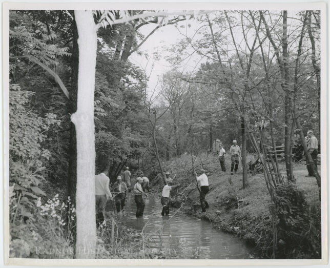 Men clear brush at Gulph Creek, possibly in preparation for the construction of a sewer line.