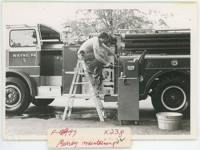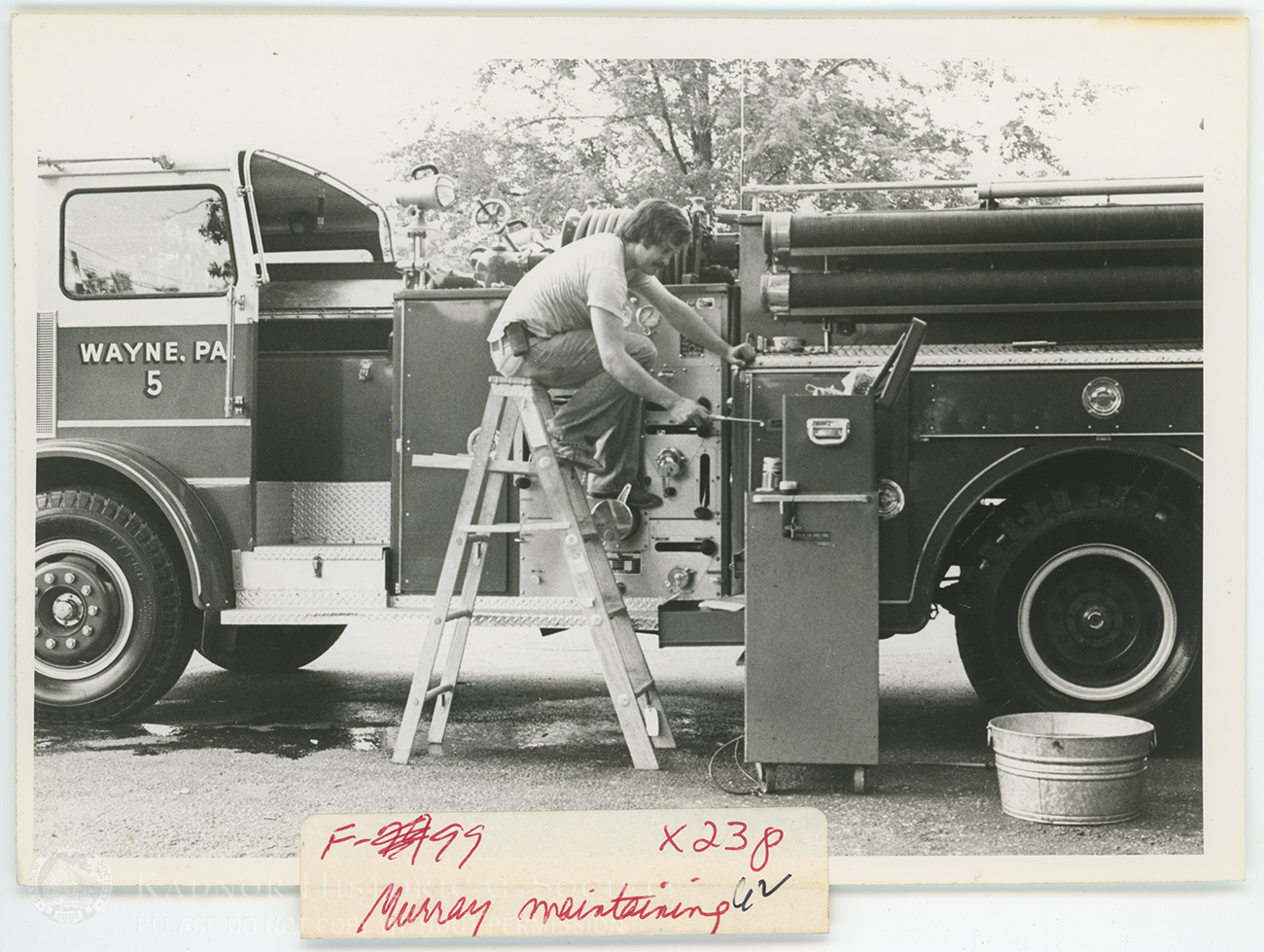 A man identified as Dennis Murray performing maintenance on a Radnor Fire Company engine.