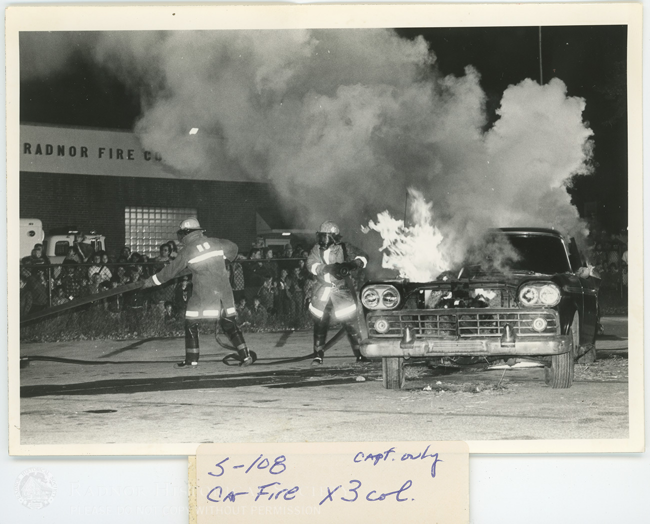 Radnor firefighters conduct a car fire demonstration in front of the fire house on South Wayne Avenue during the 1981 open house.