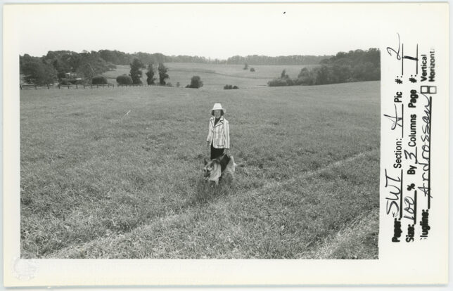 Hope Montgomery Scott with a German Shepherd on the grounds of Ardrossan.