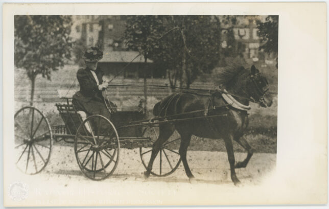 A woman driving a horse-drawn carriage, presumably in Wayne.