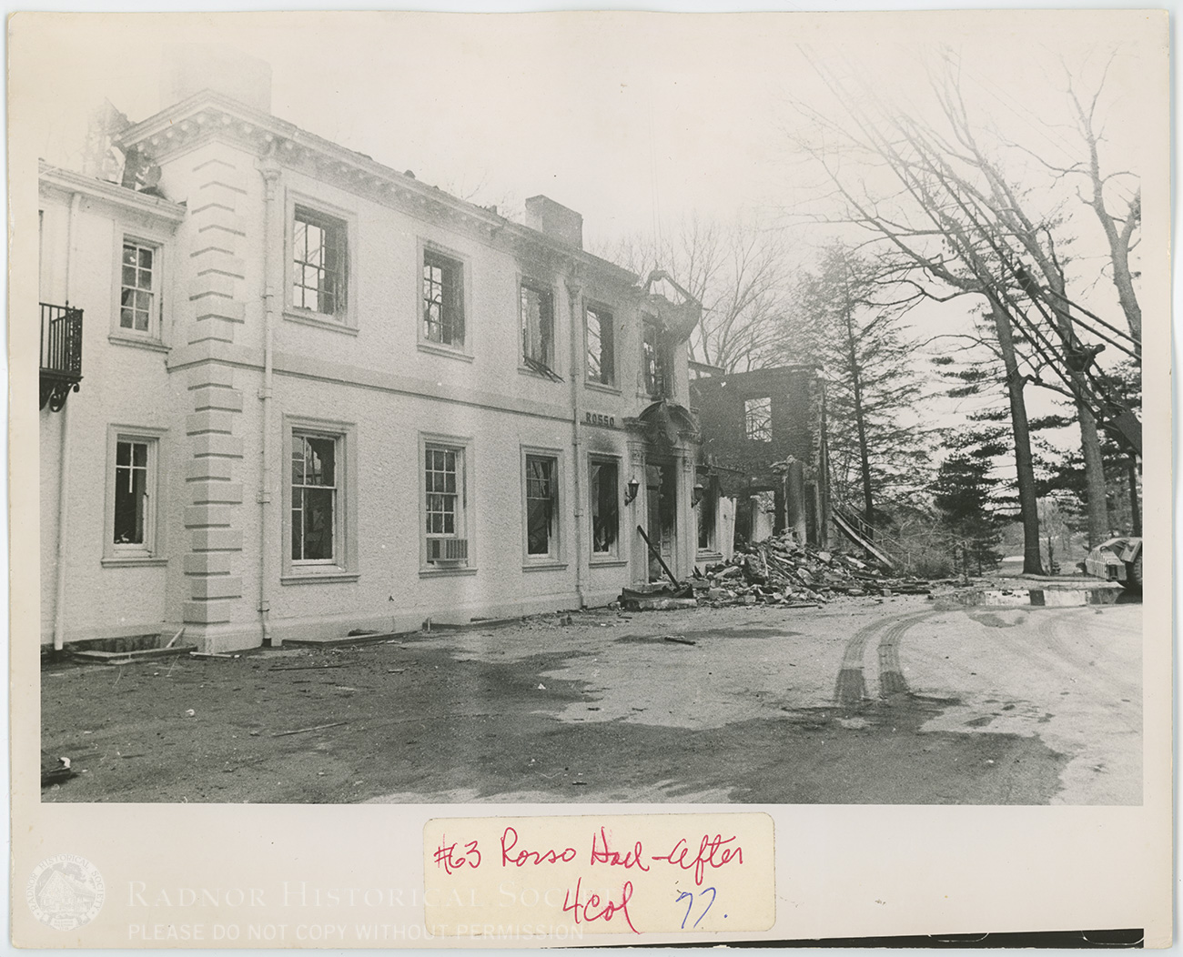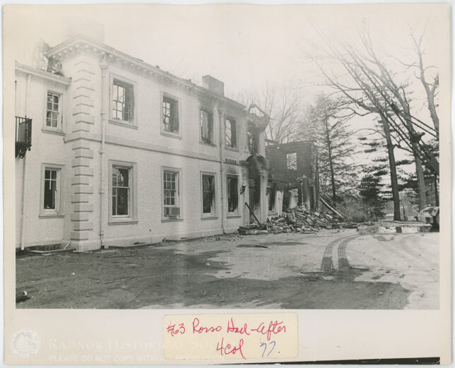 Valley Forge Military Academy’s Rosso Hall (formerly “Woodcrest Lodge”), severely damaged by fire.
