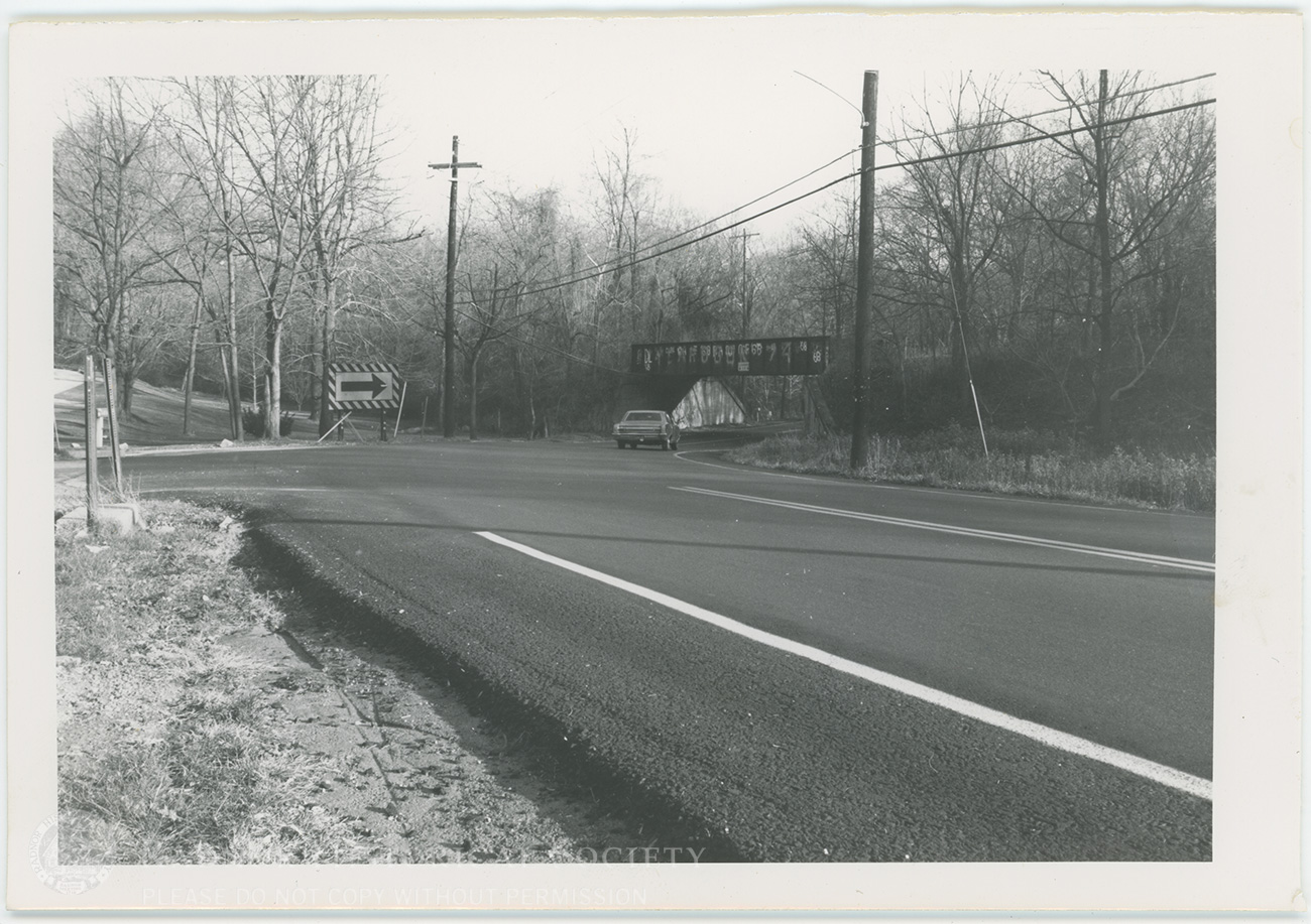 Conestoga Road at the bend near Brookside Avenue, looking east toward the former P&W bridge.