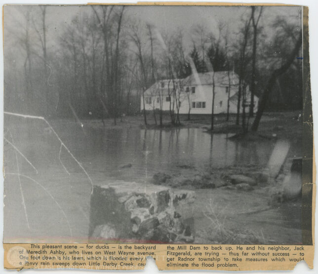Caption reads, “This pleasant scene - for ducks - is the backyard of Meredith Ashby, who lives on West Wayne avenue. One foot down is his lawn, which is flooded every time a heavy rain sweeps down Little Darby Creek, causing the Mill Dam to back up. He and his neighbor, Jack Fitzgerald, are trying - thus far without success - to get Radnor township to take measures which would eliminate the flood problem.”