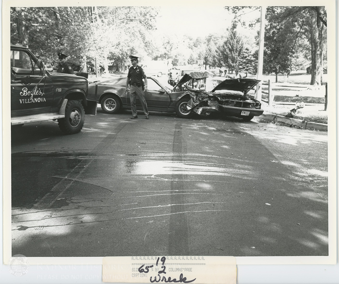 Radnor police and a tow truck responding to an automobile accident at Bryn Mawr Avenue and Mill Road.