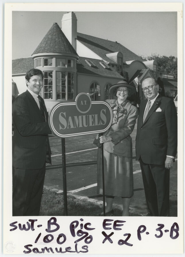 Two men, along with Dorrance Hamilton, by the sign for the A.T. Samuels restaurant at Spread Eagle Village, Strafford.