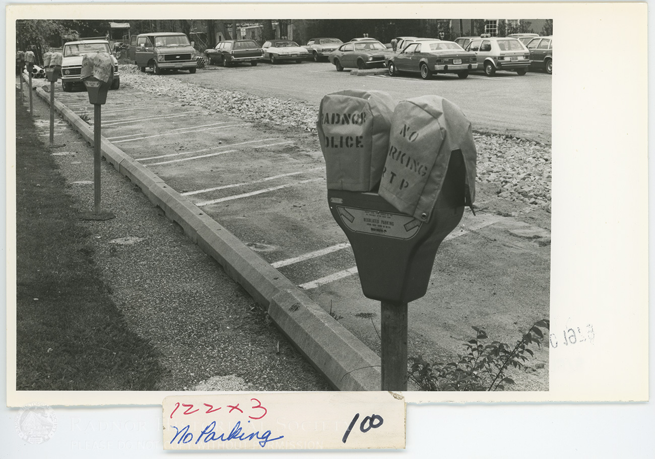 Parking meters marked for no parking by Radnor Police at a public lot.
