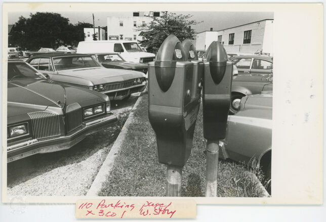 Parking meters and parked cars on the municipal parking lot south of Wayne train station.