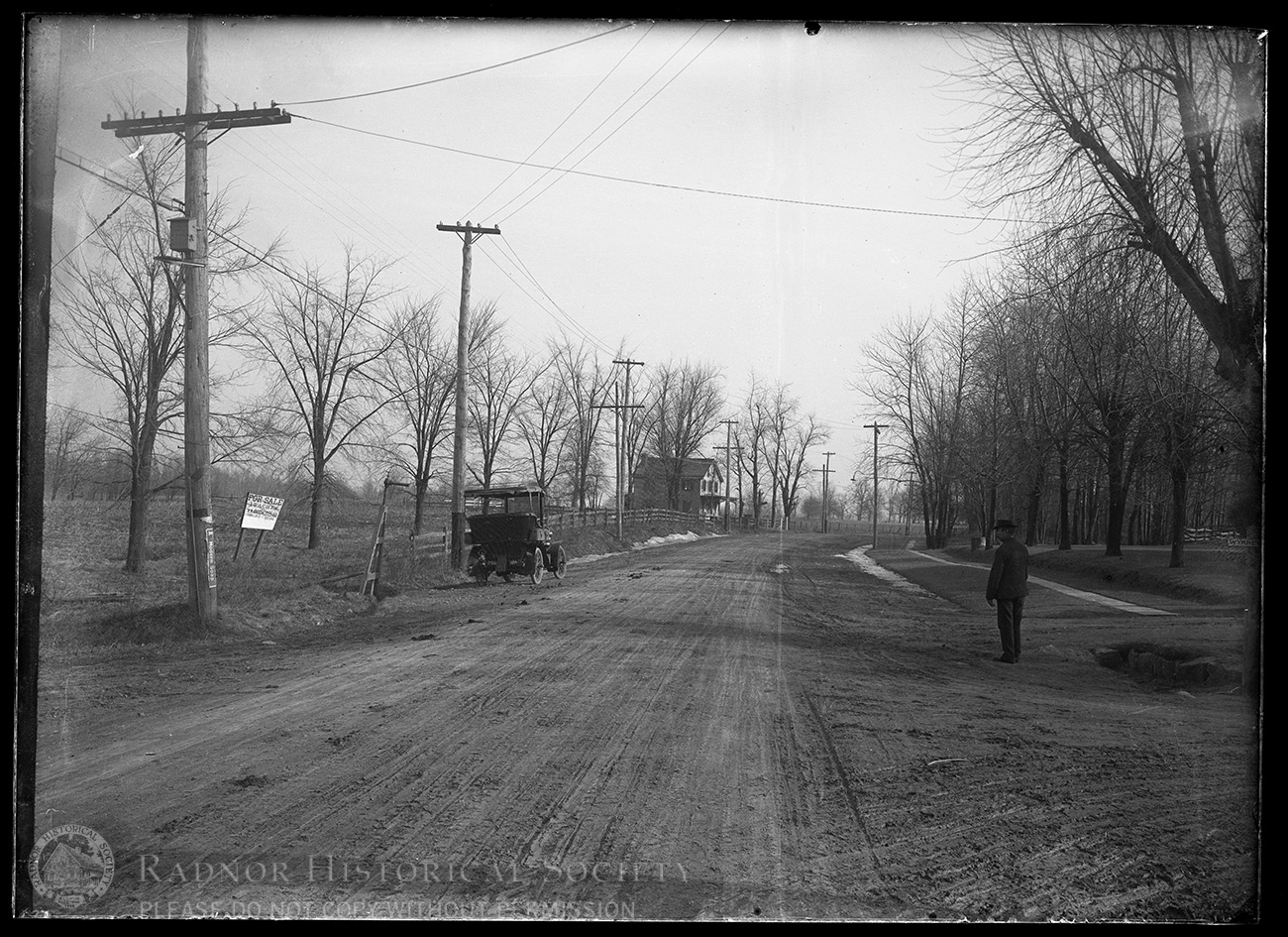 View of Montgomery Avenue, looking east, before the construction of the Wynnewood Manor development. Written on paper sleeve: “Wynnewood Manor before improvements. About 1905 - looking east on Montgomery Avenue.”