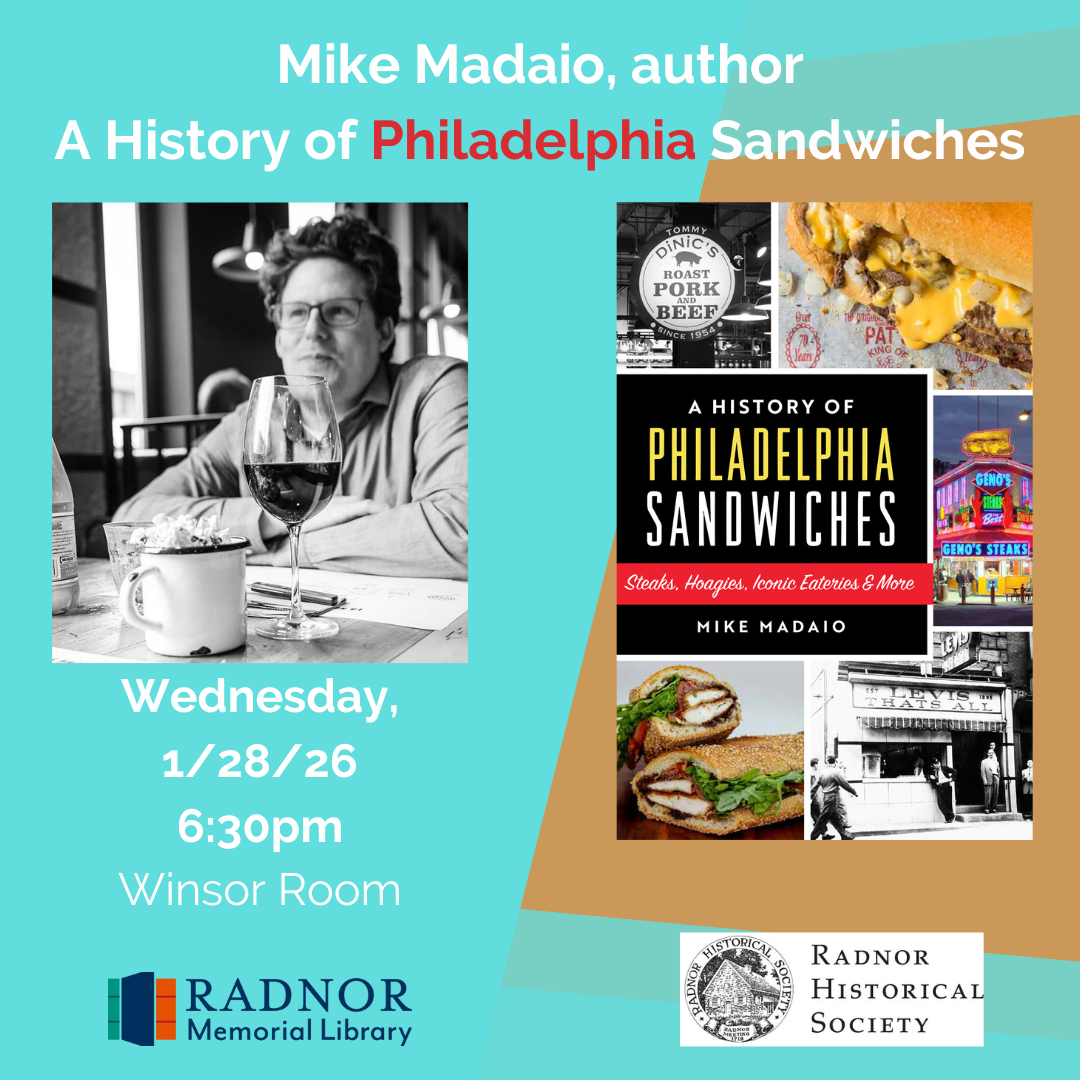 This event is at Radnor Memorial Library in the Winsor Room. It is free with reservations requested via Eventbrite. Books are for sale in advance through Eventbrite and Main Point, and will be for sale at the event.